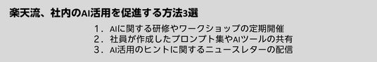 楽天モバイルでは、AI活用を全社的に推進するための包括的な教育プログラムやサポート体制の環境を整えています。社内でのAIに関する研修やワークショップを定期的に開催し、従業員がAI技術を理解し、実際の業務に応用できるようにしています。さらに、社内での成功事例をニュースレターやポータルサイトなどで共有することで、他の従業員にも積極的な利用を促進しています。このような取り組みが、楽天モバイルの高いAI利用率を実現している要因です。