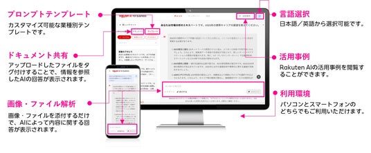 楽天モバイル株式会社(以下「楽天モバイル」)は、法人のお客様の様々な企業活動を支援する生成AIサービス「Rakuten AI for Business」を提供開始しました。言葉の理解とタスク処理能力に優れたチャット形式のAIに加え、楽天社内で培ったAI活用ノウハウを基に、導入から活用までを包括的にサポートする研修やコンサルティングのオプションも提供可能で、楽天でのAI活用事例を全ての法人のお客様に実現いただけるよう支援します。
