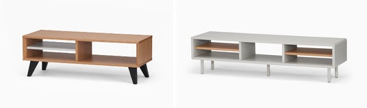組み合わせパターンは計32通りで、本体は突板仕様(2色)、単色塗装仕様(2色)、脚部は木・鉄(各2色)から選べます。さらに、本体の可動棚は6色展開しており、棚ごとに色が選べるので、本体と同色で落ち着いた雰囲気にしたり、全体とは違うトーンを選んで差し色使いにしたりすることも。耐荷重は天板40kg・棚板10kgで、ディスプレイや収納に加えて、TVボード(40kg未満)としても使用いただけます。
