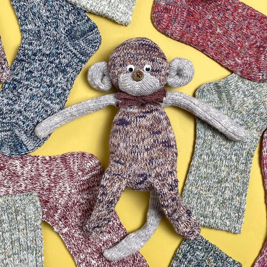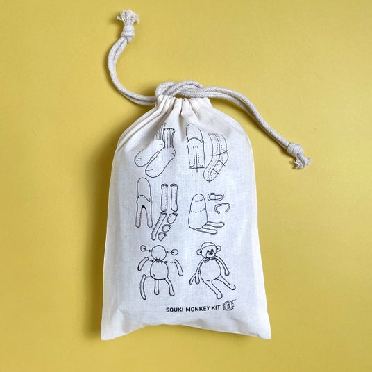 ソックモンキーは、1929年にアメリカの祖母が孫を喜ばせるため、履き古した靴下で作ったことが発祥とされています。この伝統的な作り方をベースに、創喜ならではのアレンジを加え、製作時にゴミを出さない工夫を凝らしました。また、キットのパッケージには布製の巾着袋を使用し、再利用が可能です。