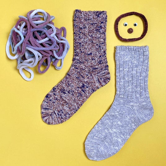 ぬいぐるみの材料となる靴下は、工場で余ってしまった残糸を使い、キッズサイズの靴下としてランダムにペアリングされています。さらに、ぬいぐるみの中に詰める素材には、靴下のつま先を縫製する際に切り取られる輪っか状の端材を活用。これまで廃棄するしかなかった素材を活かした、作る過程も楽しめるぬいぐるみキットです。