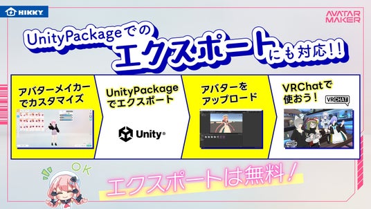 Avatar Makerで制作したアバターをUnityPackage形式でエクスポートできる機能も新たにリリースいたします。これまでVRMデータのみに対応していましたが、UnityPackage形式でエクスポートができることで、よりスムーズに制作したアバターを「VRChat」へアップロードすることができます。直接アップロード機能が使用できないアイテムについてはぜひ本機能をご活用ください。