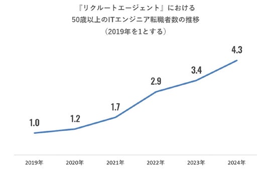 50歳以上のITエンジニアの転職が加速している。『リクルートエージェント』における50歳以上のITエンジニア職(SE、インターネット専門職、組込・制御ソフトウエア開発エンジニア)の転職者数は2019年を1とすると2024年は4.3倍に増えている。