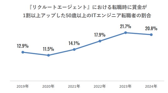 50歳以上のITエンジニアで、転職時に賃金が1割以上アップした転職者の割合は2019年には12.9%だったのに対し、2024年には20.8%まで増加している。労働市場全体でIT人材が不足している中でIT人材の賃金は上昇傾向にあるが、50歳以上でも同様の傾向が見られることが分かった。