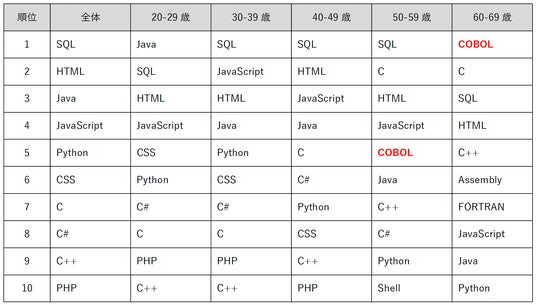 COBOLが上位10言語にランクインしたのは50歳以上のみであった。レガシーシステムの維持・刷新を行いたい企業にとって、50歳以上のITエンジニアはニーズにマッチする可能性が高いと言える。なおCOBOLが日本で使われ始めたのは1960年代で、大規模システムを中心に広く使われていたが、JavaやC++など新たな言語が登場すると、ITエンジニアの学習対象も新しい言語へと移っていった。そのため若手の中でCOBOLを扱える人の割合は低い。また、50歳以上のエンジニアにはCOBOLのスキルだけでなく、豊富なトラブルシューティングの経験や若手の育成などの経験にも期待が寄せられている。