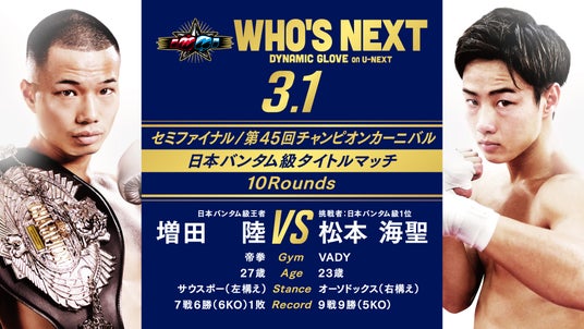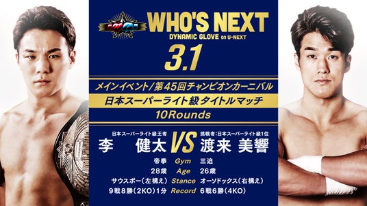 日本王者が最強挑戦者を迎え撃つ「春の祭典」チャンピオンカーニバルの2王座戦が第30回WHO′NEXT DYNAMIC GLOVE on U-NEXTで行われる。メインイベントで日本スーパーライト級王者の李健太(帝拳)が同級1位の渡来美響(三迫)と2度目の防衛戦。セミファイナルで日本バンタム級王者の増田陸(帝拳)が同級1位の松本海聖(VADY)と2度目の防衛戦で、それぞれ激突する。