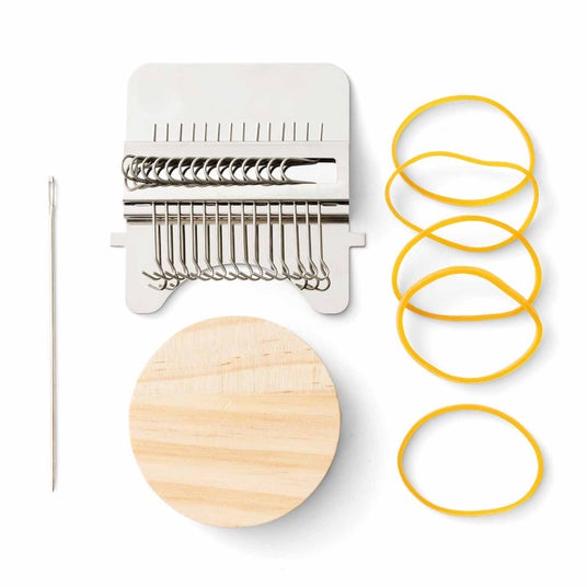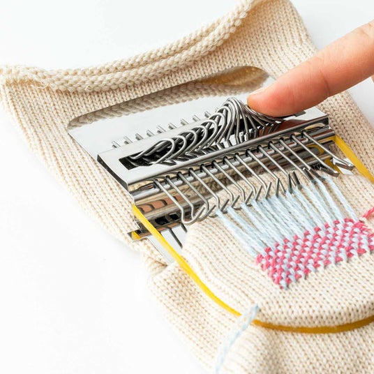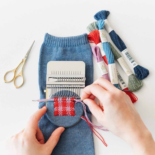人気のダーニングを楽しくかわいく練習できるキットの登場です。別売りの小さな織り機「ウィービングルーム」を使うことで、織りや刺しゅうの経験がなくても気軽に繕いが始められます。織り模様を入れたいところに織り機をセットして、図案に従ってタテ糸を張りヨコ糸を通すだけ。フックでらくらくタテ糸が入れ替わるので、ヨコ糸を通す作業がすいすい楽しく進められます。