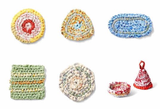 キットの布で6種類の編み方を練習。上段左から 丸・三角・楕円、下段 四角・六角形・立体