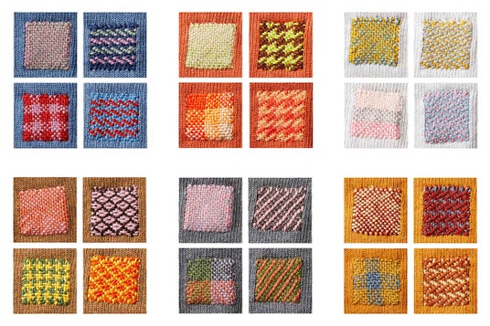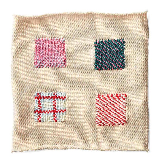 1回に約3.5cm正方の織り模様を4つ作れる図案と作り方説明書、材料が届きます。一緒に届く筒状のニット地に専用織り機を使ってサンプラーを作ったら、残りの糸で愛用の靴下など実際に繕いができます。お気に入りのニット帽やウエアをダーニングでアクセサリーのようにデコレーションすることも。ポケットみたいに織りつけることもできます。