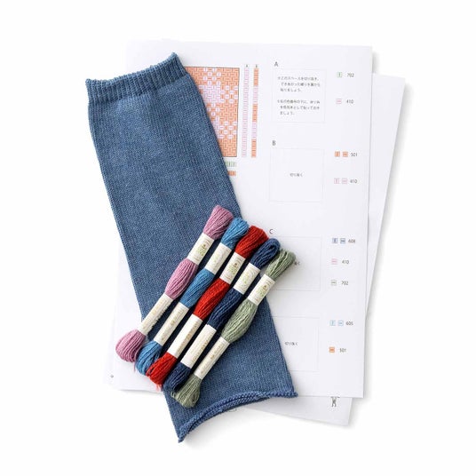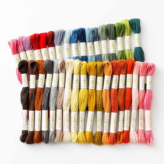 技法だけでなく素材でもサステナブルに着目。セットのDMC社のウール刺しゅう糸エコ ヴィータは100%オーガニック素材を使用し、すべて天然素材で染色されています。1回につき5色セットでお届けされ、全7回で35色がそろいます。