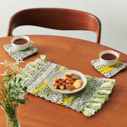 クチュリエでは、アップサイクルを提案するキットも発売しています。布を裂いてひも状にしたら、専用の竹針で編んでいく「アップサイクルを始めよう スラッシュラグのアレンジレッスンの会」はかわいいインテリアアイテムを作ることができます。キットの布で練習したあとは、お手持ちのお気に入りの布や古びた洋服などの生地を再利用して、オリジナルの作品にチャレンジすることができます。裂いたり編んだりする作業も夢中になって取り組めます。
