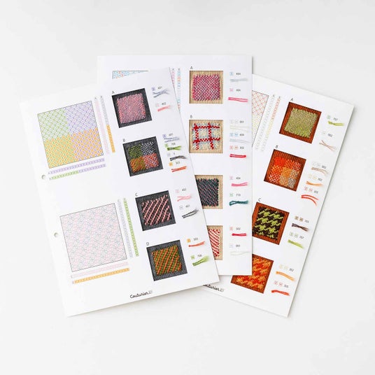 サンプラーとしてファイリングもできる図案兼台紙もセットされています。できあがった織り地と糸を貼って図案とともに後で見返すことができます。