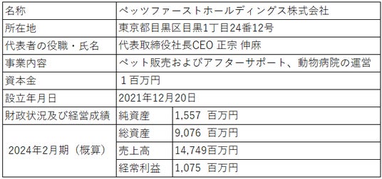 対象会社であるペッツファーストHDはペッツファースト株式会社(2008年4月設立)等の7社を傘下にペット販売からアフターサポート・動物病院・ペット保険等のペットの生涯に寄り添う、ペットの総合企業を目指し、104拠点のペット販売店及び動物病院等を展開しております。