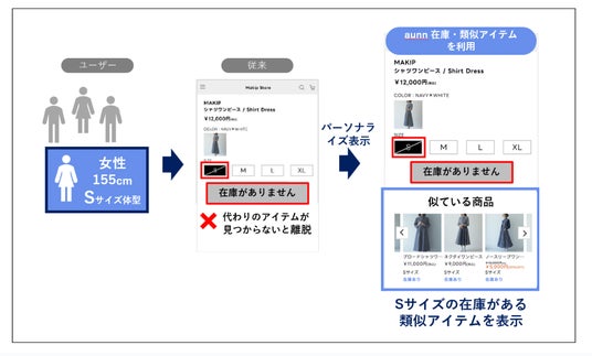 株式会社メイキップ(東京都新宿区、代表取締役:柄本 真吾、以下「メイキップ」)が提供するパーソナライズサービス「aunn Personalization」は、新機能「aunn 在庫・類似アイテム」の提供を開始します。本機能では、ユーザーが閲覧しているアイテムで、ユーザーの体型に合うサイズが欠品している場合に、在庫がある類似アイテムを自動で表示します。それにより「サイズがなくて購入を諦めた」という喪失感を解消し、新たな購買の選択肢を提供することでユーザーの満足度を高めます。