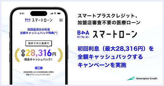 次世代金融インフラの提供を通して組込型金融を実現するFinatextグループの株式会社スマートプラスクレジット(本社:東京都千代田区、代表取締役:大澤 和明、以下「スマートプラスクレジット」)は、自由診療クリニック特化型のDXツール「B4A(ビーフォーエー)」を開発・提供する株式会社B4A (本社:東京都港区、代表取締役CEO:植松 正太郎)との協業で提供している医療ローンサービス「B4Aスマートローン」にて、最大28,316円の初回利息を全額キャッシュバックするキャンペーンを2025年2月27日(木)より開始いたします。