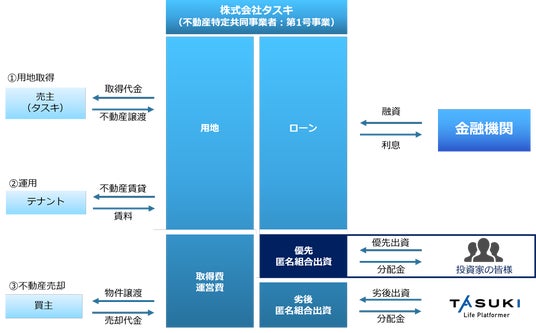優先劣後方式により、投資家の皆様へは優先出資分として350口を募集します。一方、タスキは100口を劣後出資いたします。万一、損失が発生した場合、タスキが先に損失部分を負担しますので、投資家の皆様は、タスキより優先して出資金の返還を受けることができます。