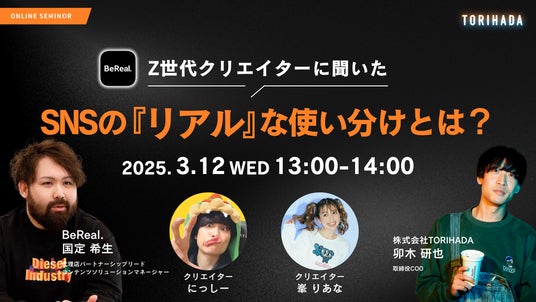 株式会社TORIHADA主催『Z世代クリエイターに聞いた、SNSの ”リアル” な使い分けとは?』では、写真共有アプリ「BeReal.」を運営するVoodoo社とSNSの最前線で活躍するクリエイターをお招きし、各SNSにおける使い分けや今後の展望などをリアルに徹底解説いたします。