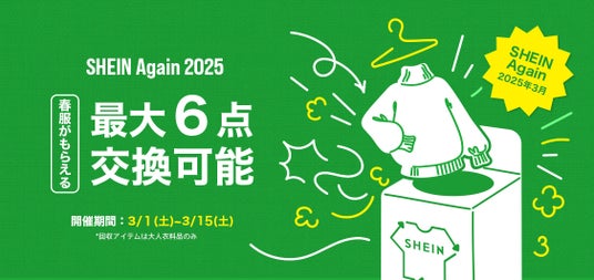 「SHEIN」は、2025年2月1日(土)~2025年2月15日(土)の期間に、古着交換・寄付キャンペーン第7弾となる『#SHEIN Again』を開催し、557名のお客様にご利用いただきました。好評につき、2025年3月1日(土)~2025年3月15日(土)に第8弾となる『#SHEIN Again』を開催いたします。