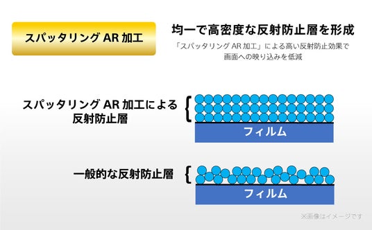 ・「スパッタリングAR加工」という高い反射防止効果をもたらす表面処理により、画面への映り込みを低減。また、画面の色合い、特に黒色が引き締まって見えます。