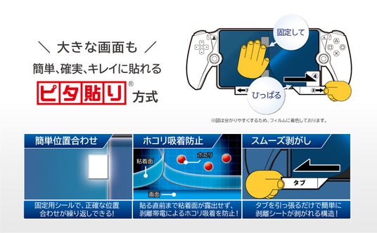 ・HORI独自技術”ピタ貼り”により、サイズが大きいPlayStation Portal(TM) リモートプレーヤーの液晶画面でも、位置ズレや気泡の入りが起きにくい構造になっています。