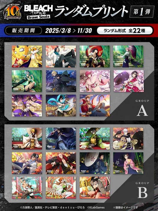 さらに抽選で30名様に、「BLEACH Brave Soulsランダムプリント」で入手できるブロマイドのうち、平子真子、毒ヶ峰リルカ、雛森桃のセットをプレゼント!