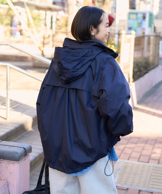 スタンドネックからはフードを出すこともでき、雨の日の自転車にも便利な一着。