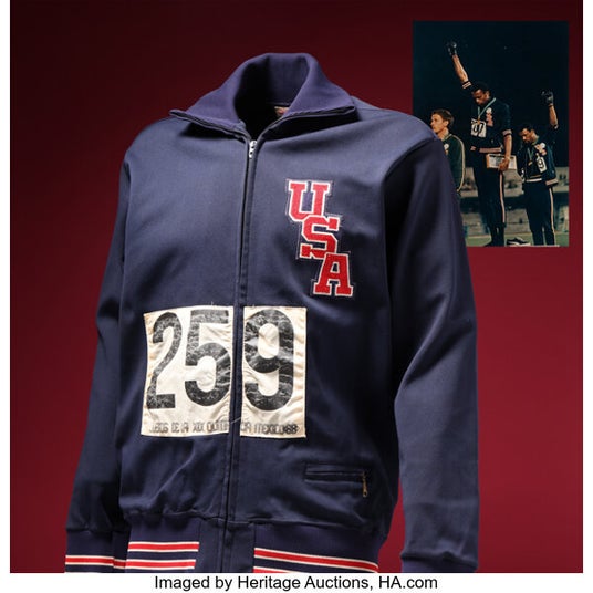 さらには、1968年10月のメキシコシティーオリンピックの表彰台で、チームメイトのトミー・スミスとともに拳を突き上げ、黒人差別への抗議を示した陸上競技選手、ジョン・カーロスが着用していたアメリカ代表のトラックジャケットが、50万200ドル(7,550万円)で落札されました。抗議の瞬間を収めた写真は、国際写真センター(International Photography Center)が「公民権運動において最も象徴的な写真の一つ」と称しています。