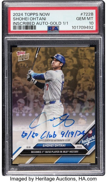 カードの表面には、シーズン50号ホームランを放ったスイングの瞬間が収められており、大谷自身が直筆サインとともに「50/50 Club, 9/19/24」と記入しています。 左上には、銀色のスタンプで「1/1」と刻まれており、世界に一枚しか存在しないことを示しています。 さらに、「50/50」と「1/1」の表記に加え、PSA Gem Mint 10の評価もこのカードの価値を一層高め、最終的には22万5,700ドル(3,405万円)で落札されました。