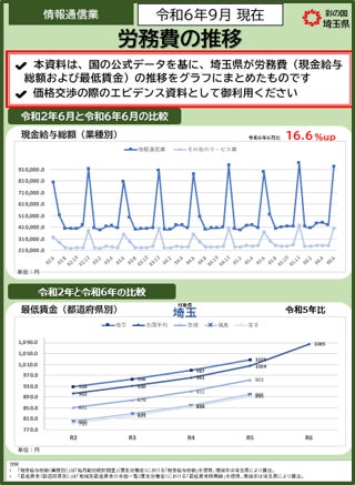 このたび、労務費の価格交渉にも対応できるよう、労務費データ(業種別現金給与総額、都道府県別最低賃金、男女間賃金格差)を分析できる機能を追加し、県ホームページで公開しました。