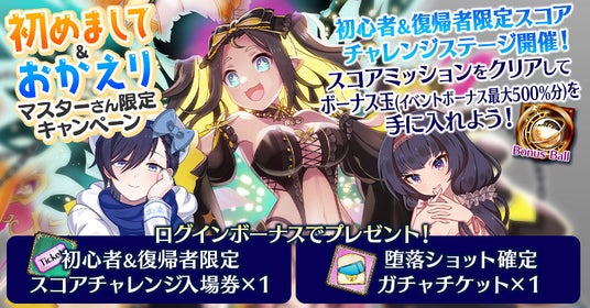 イベントボーナス最大500%分のボーナス玉が獲得できるスコアチャレンジステージをプレイできる入場券と、堕落ショット持ち使い魔が1体手に入るガチャチケットをプレゼント!