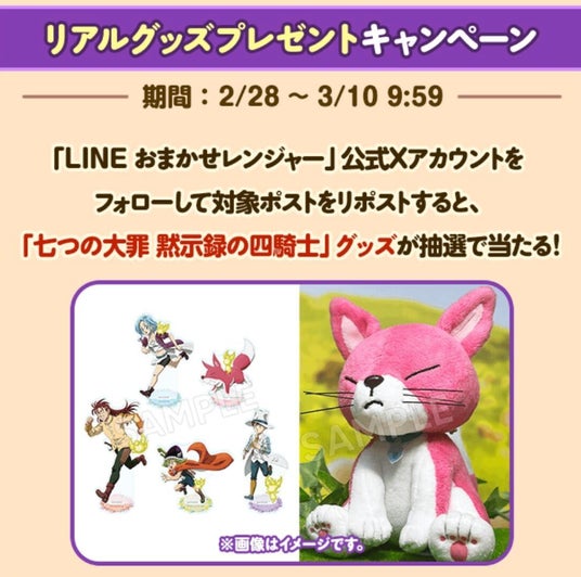 コラボを記念して「LINE おまかせレンジャー」の公式X(旧Twitter)アカウント(https://x.com/LINE_OMAREN_JP)をフォローしてキャンペーンポストをリポストすると、『七つの大罪 黙示録の四騎士』グッズが抽選で当たるキャンペーンを実施します。