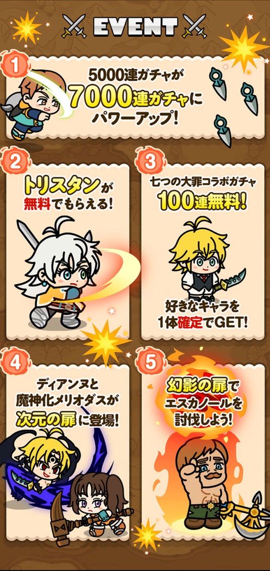 『七つの大罪 憤怒の審判』コラボを記念し、期間中は通常の5000連ガチャが7000連ガチャにバージョンアップ。さらに100連無料ガチャも開催。好きなキャラを1体確定で入手することができます。