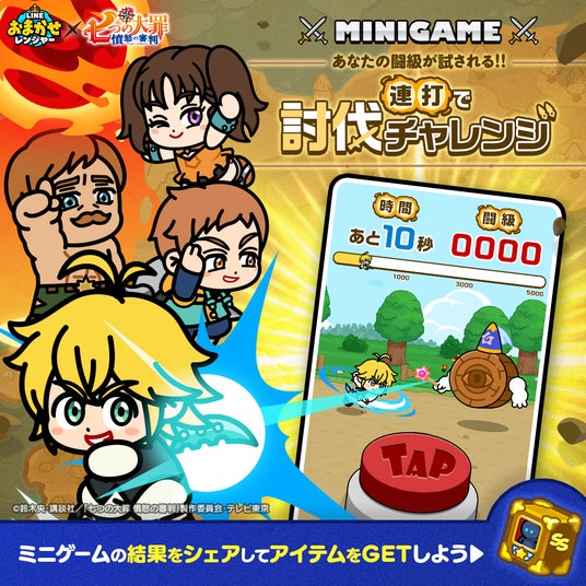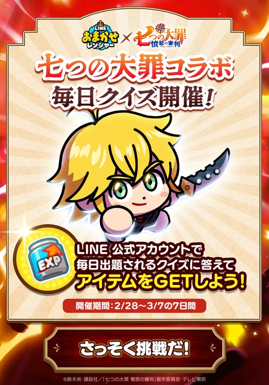 LINEヤフー株式会社は、当社が展開する放置系RPG「LINE おまかせレンジャー」(iPhone・Android対応/無料)において、本日2月28日より、アニメ『七つの大罪 憤怒の審判』とのコラボレーションを開始しました。