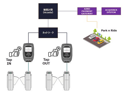 AINOは駅改札またはバス車載端末で利用者のスマートフォンからNFC方式で決済情報を読み取り、電文をQRISフォーマットに変換します。その後、運賃情報を付加し、マルチアクワイアリング機能を搭載したAcasia2.0 Payment Gatewayモジュールを通じて、アクワイアラーへ決済データを連携します。