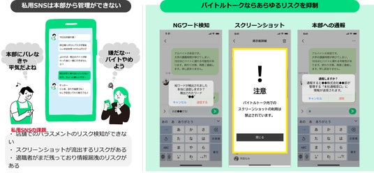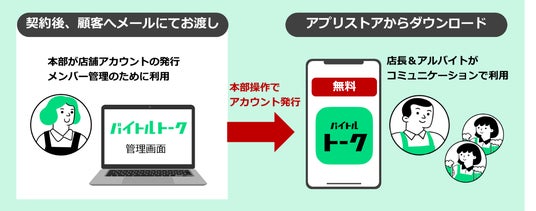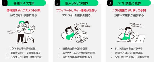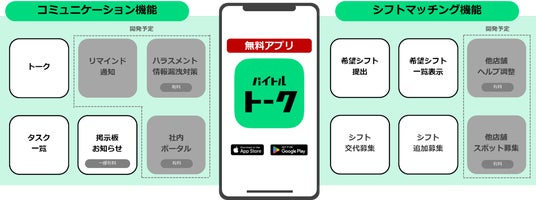 本サービスは、アルバイト従業員と店舗管理者のコミュニケーションを改善するアルバイトコミュニケーションアプリで、安心・安全なアルバイト連絡、ストレスのないシフト調整を行えるプラットフォームを提供します。