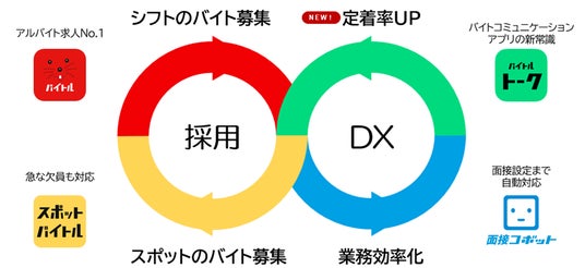 日本最大級のアルバイト・パート求人情報サイト「バイトル」を運営する当社は、ユーザーファーストというフィロソフィーに基づき、スポットワークで優良な働きをする方の待遇を引き上げていくため、日本初の独自機能「Good Job ボーナス」を搭載したスポットのバイトサービス「スポットバイトル」を2024年10月より開始しました。また、人手不足や業務効率に課題を抱える業界・業種での定型業務を自動化するDXサービス「コボット」シリーズを展開しております。この度の「バイトルトーク」開始により、アルバイト従業員と店舗管理者側のコミュニケーションを改善し、労働市場における諸課題の解決につなげてまいります。
