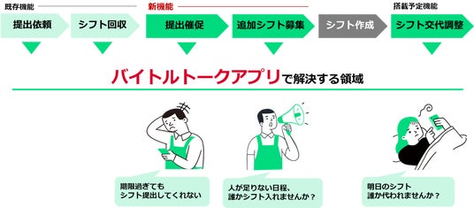 アルバイト従業員とのトーク、希望シフトの回収、希望シフトの一覧表示に加え、提出催促や追加シフト募集も可能となりました。これにより店舗管理者が行うシフト調整コミュニケーションを「バイトルトーク」上で完結することができます。なお、アルバイト従業員同士のシフト交代調整も今後本サービス上で可能にする予定です。