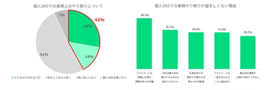 アルバイト従業員の42%が個人SNSでの業務上のコミュニケーションを問題視しており、その理由は「プライベートな時間に仕事の連絡が来ることを避けたい」「SNSは個人的なつながりにとどめておきたい」等があげられます。