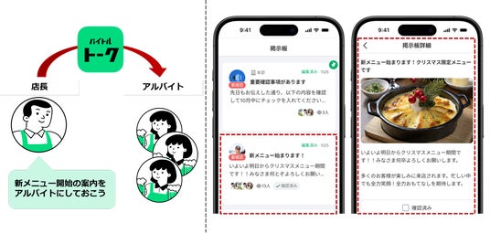 店舗では新メニューやキャンペーンなどアルバイト従業員へ周知したい情報が頻繁に発生します。そこでバイトルトーク上に掲示板機能を追加いたしました。