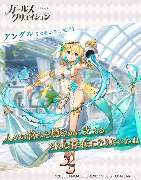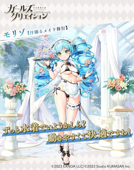 合同会社EXNOA(本社:東京都港区、CEO:村中 悠介、URL:https://games.dmm.com/)が運営するDMM GAMESにおいて、「クリエイティブチーム くまさん」第4弾作品となる『ガールズクリエイション -少女藝術綺譚-』(以下、『ガールズクリエイション』)にて、サービス開始500日を記念して「開館500日記念キャンペーン」およびイベント「リフレッシュ!爽快スパリゾート♪」を開催いたしました。また、水着衣装のモリゾ★5スタイル【汗滴るメイド修行】とアングル★5スタイル【水壺が描く境界】が新登場のピックアップガチャの開催もお知らせいたします。