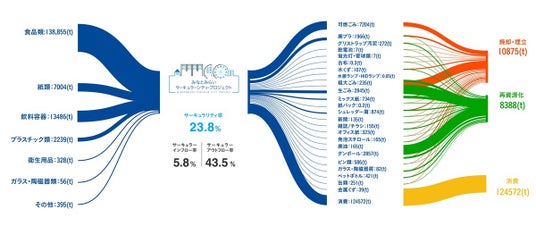 調達した資源全体に対し再生可能な資源の割合を示す「サーキュラー・インフロー率」と、排出した資源全体に対し再生可能な資源が実際に回収された割合を示す「サーキュラー・アウトフロー率」を算出するとともに、これらの加重平均(※)により、全体の循環性を数値化した「マテリアル・サーキュラリティ率」を算出しています。