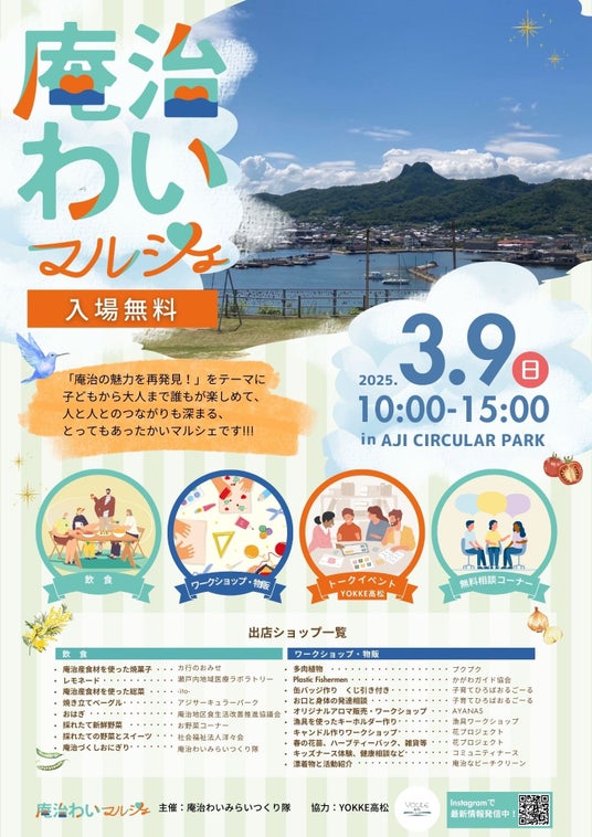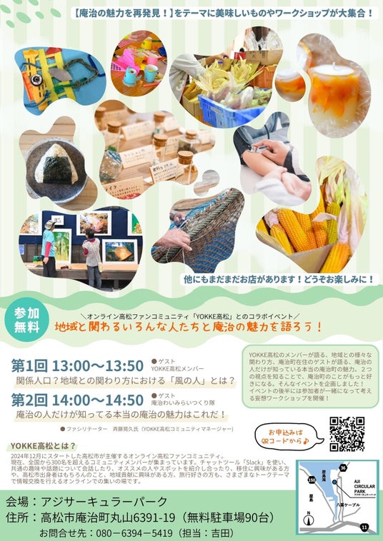 この度、関係人口創出を目的としたオンラインファンコミュニティ「YOKKE高松」を通じて、庵治町で開催される「庵治わいマルシェ」とコラボイベントを開催します。イベント当日は高松市内外のYOKKE高松メンバーが庵治町に足を運び、現地の運営スタッフとともにマルシェを盛り上げます。