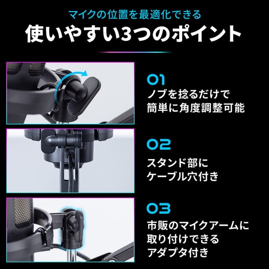 サンワサプライ株式会社(本社:岡山市北区田町1-10-1、 代表取締役社長 山田 和範)が運営している直販サイト『サンワダイレクト』では、マイク位置を自由自在に調整できるスタンド付きで、ショックマウントやポップガード付きで息や振動ノイズを軽減できるゲームや音声収録、動画配信やWEB会議に最適なUSBマイク「400-MC024」を発売しました。