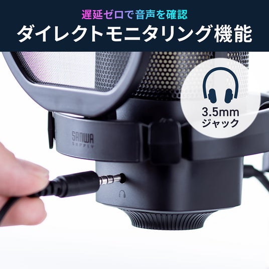 本体にはタッチ式のマイクミュートボタンやLEDライティングボタンを搭載。操作時のクリック音を防ぎ、静かに切り替えが可能です。また、ヘッドホンジャックを備えており、ダイレクトモニタリングも可能。自身の声をリアルタイムで確認でき、配信や録音時のクオリティ向上に貢献します。
