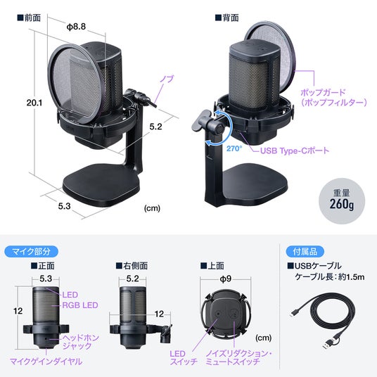 USBゲーミングマイク コンデンサーマイク RGBライティング ノイズキャンセル 単一指向性 スタンド 配信用 ゲーム実況 ボイスチャット web会議 録音 PC PS5/4