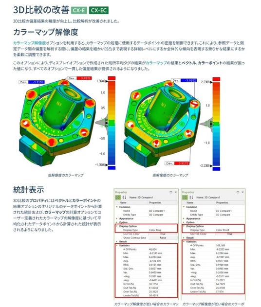カラーマップ解像度オプションにより、CAD比較精度を用途に応じてコントロールし易くなりました。細かい差異を解析したい時と、大まかにギャップを確認したい時に柔軟に調整が可能です。