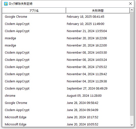 ロックされているアプリを起動しようと思って間違ったパスコードを入力した場合、AppCryptはアプリ名、失敗時間を記録します。