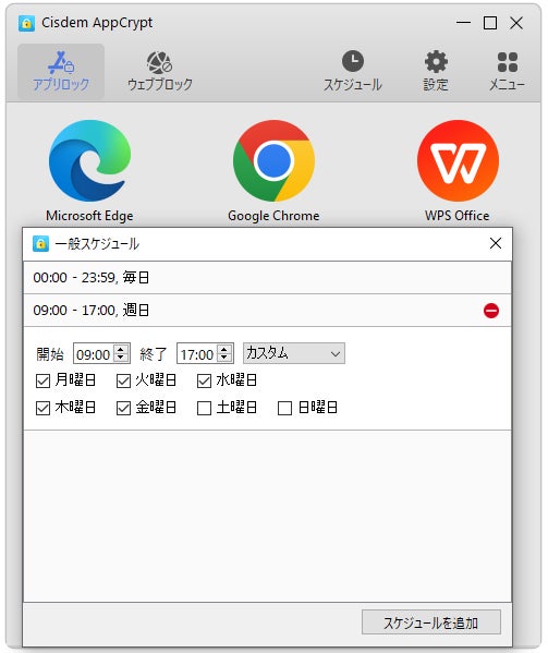 デフォルトでは、ロックされたアプリとブロックされたサイトは永久にロック/ブロックされますが、カスタムスケジュールと一般スケジュール機能が搭載されているので柔軟性があります。