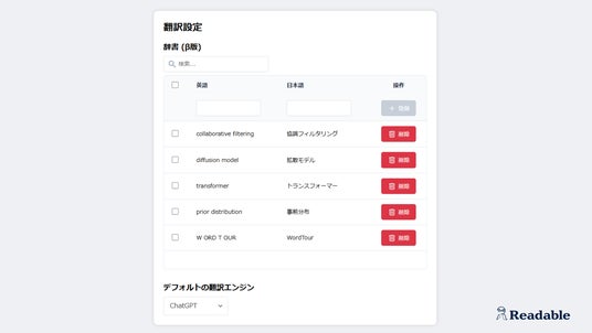 Readableは2023年、日本の科学技術分野や教育分野での発展に寄与したことが認められ、京都大学 第17回ICTイノベーション優秀研究賞を受賞したパワフルなAI翻訳ツールです。今回の利用プランの刷新により、従来の高性能な翻訳機能に加え、Pro Premiumでは辞書登録機能などの新機能を搭載し、さらなる翻訳業務の利便性の向上を実現しました。