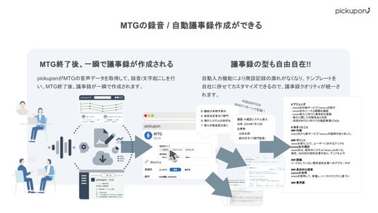 pickuponがMTGの音声データを取得して、録音/文字起こしを行い、MTG終了後、議事録が一瞬で作成されます。